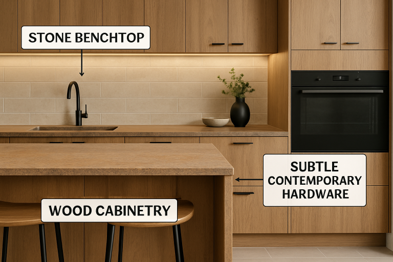 - Warm, earthy tones are increasingly prevalent in contemporary stone benchtops.